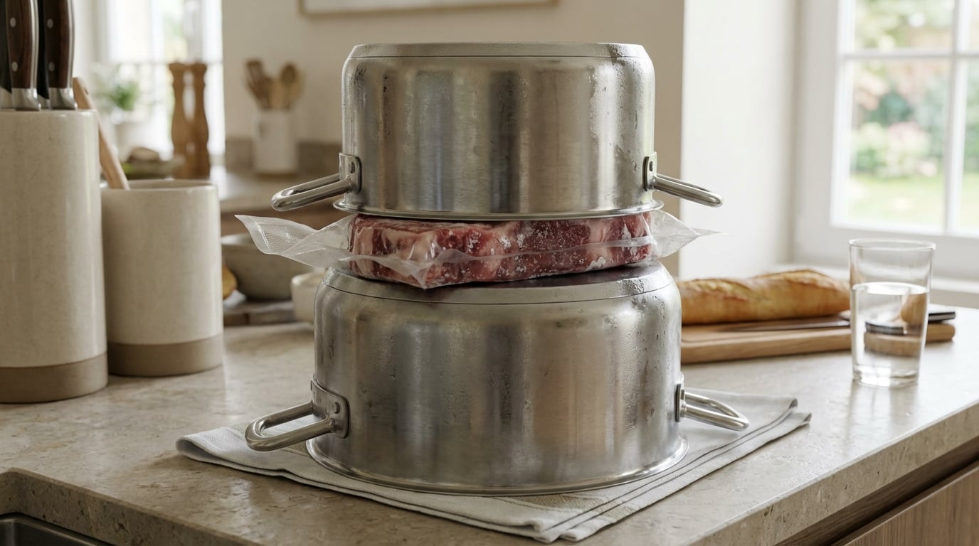 The technique is straightforward. You need two large metal pots or saucepans, clean and completely dry. Flip the first pot upside down on the countertop. Place the meat directly on it, still in its original packaging or a sealed freezer bag. Then set the second pot on top, bottom facing down against the meat.